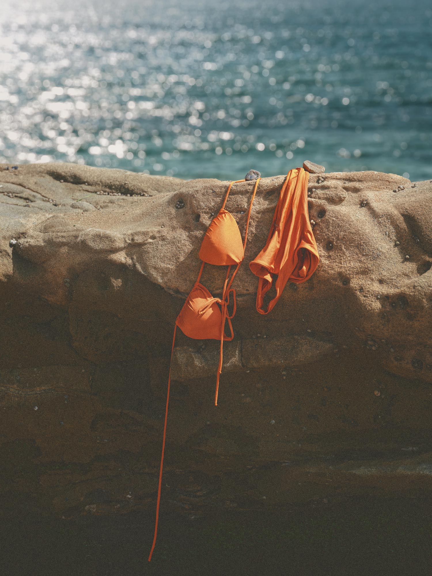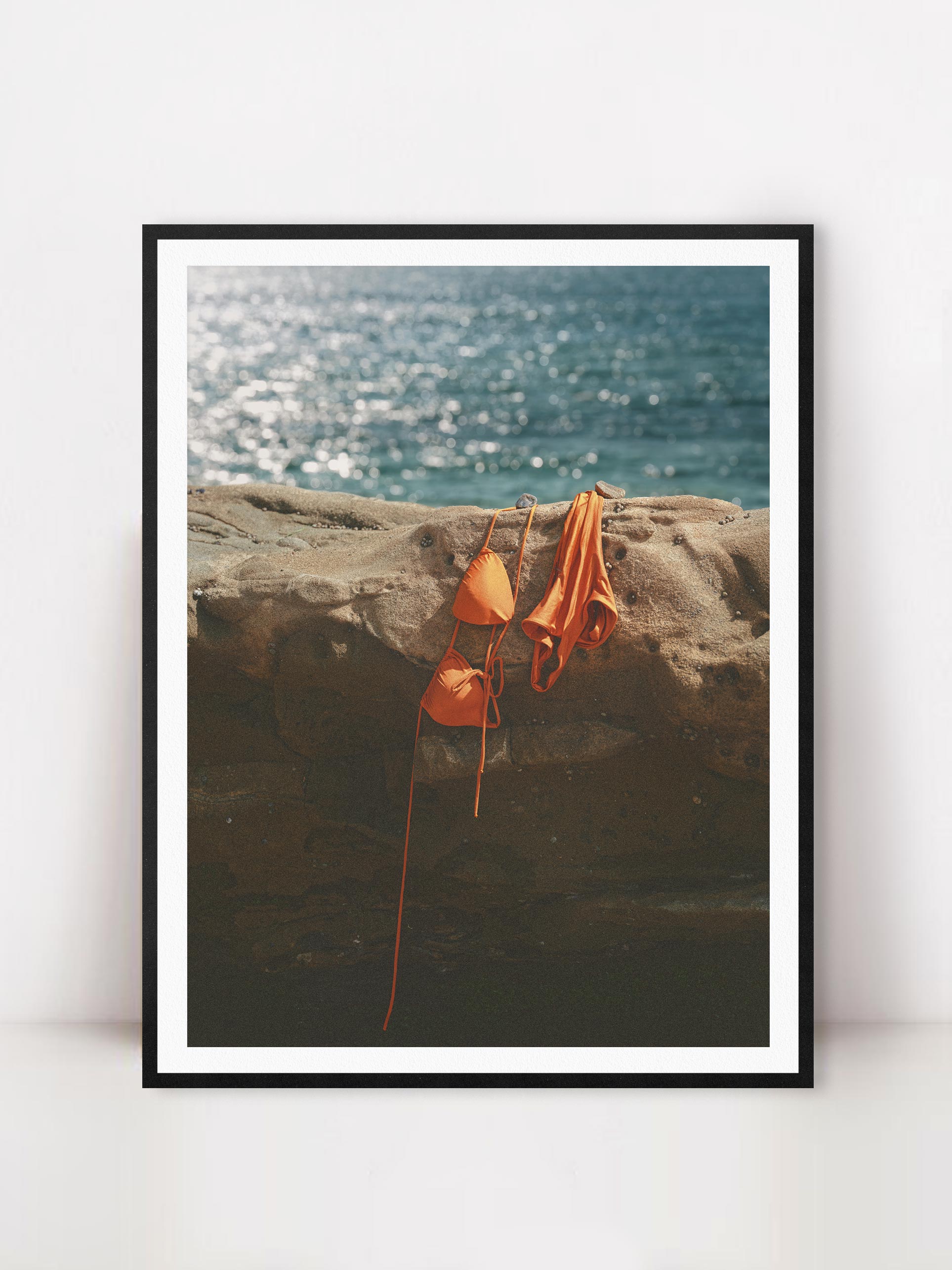 Photograph of an orange bikini sun-drying on the rocks in La Jolla, San Diego. Printed on premium Fuji Crystal Archive luster paper. Printed and hand packaged in San Diego, CA. A portion of proceeds from the Guimuse West Coast Collection goes towards the The Ocean Cleanup to help extract plastic pollution from our oceans.