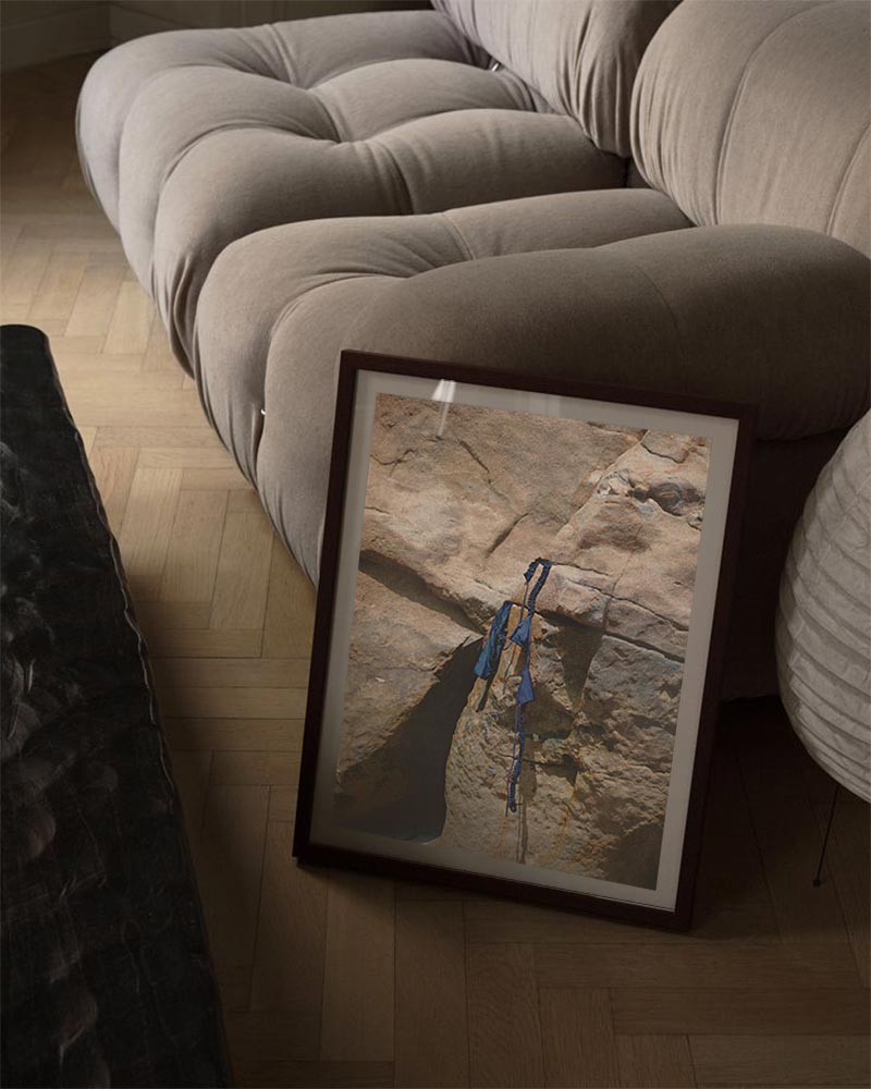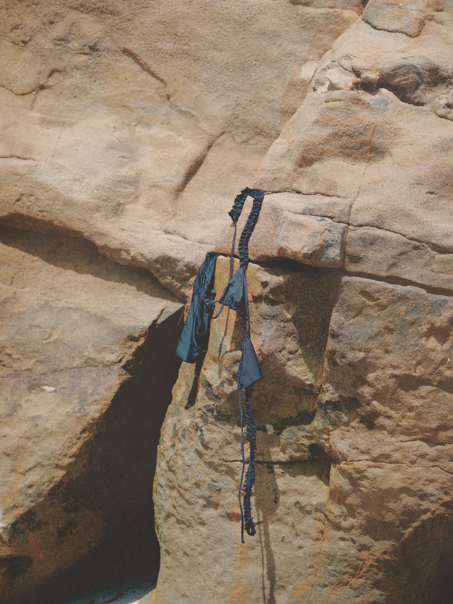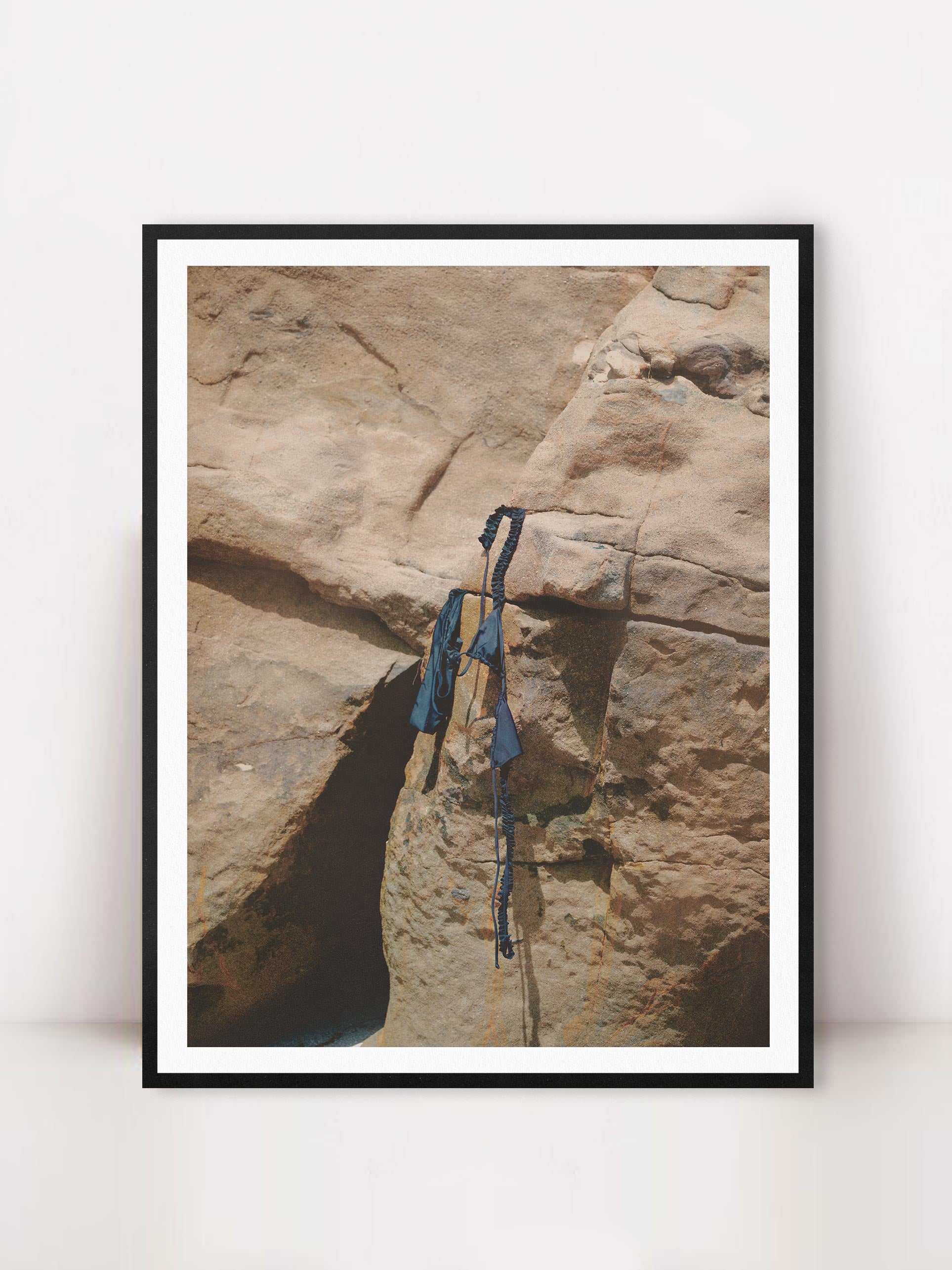 Photograph of a black ruffle bikini sun-drying on the rocks in La Jolla, San Diego. Printed on premium Fuji Crystal Archive luster paper. Printed and hand packaged in San Diego, CA. A portion of proceeds from the Guimuse West Coast Collection goes towards the The Ocean Cleanup to help extract plastic pollution from our oceans.