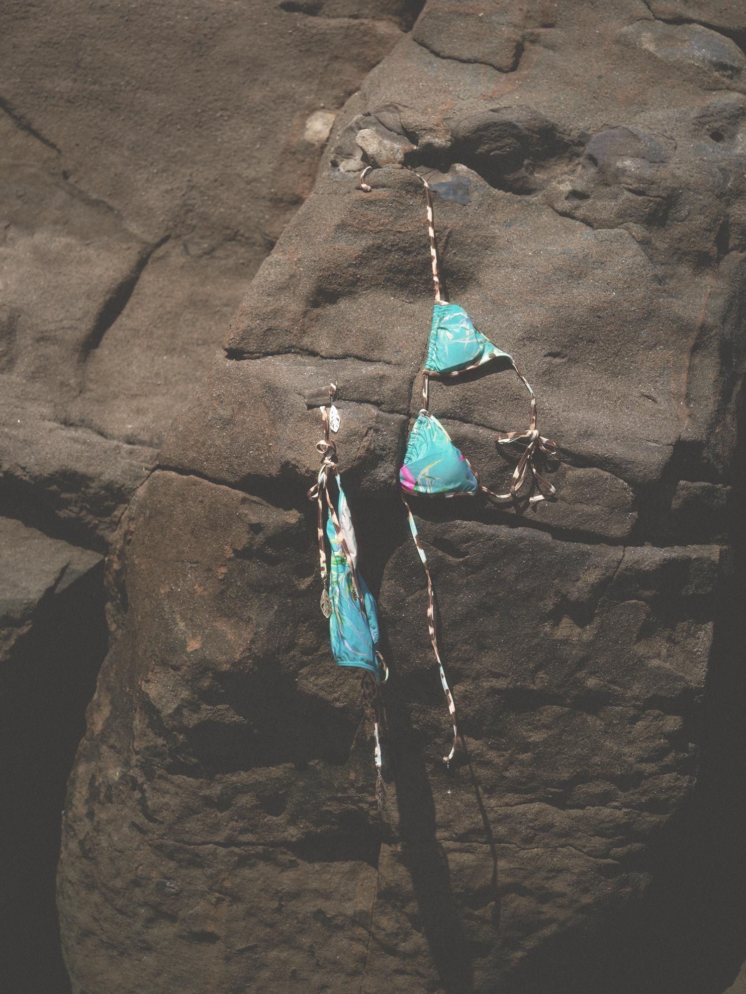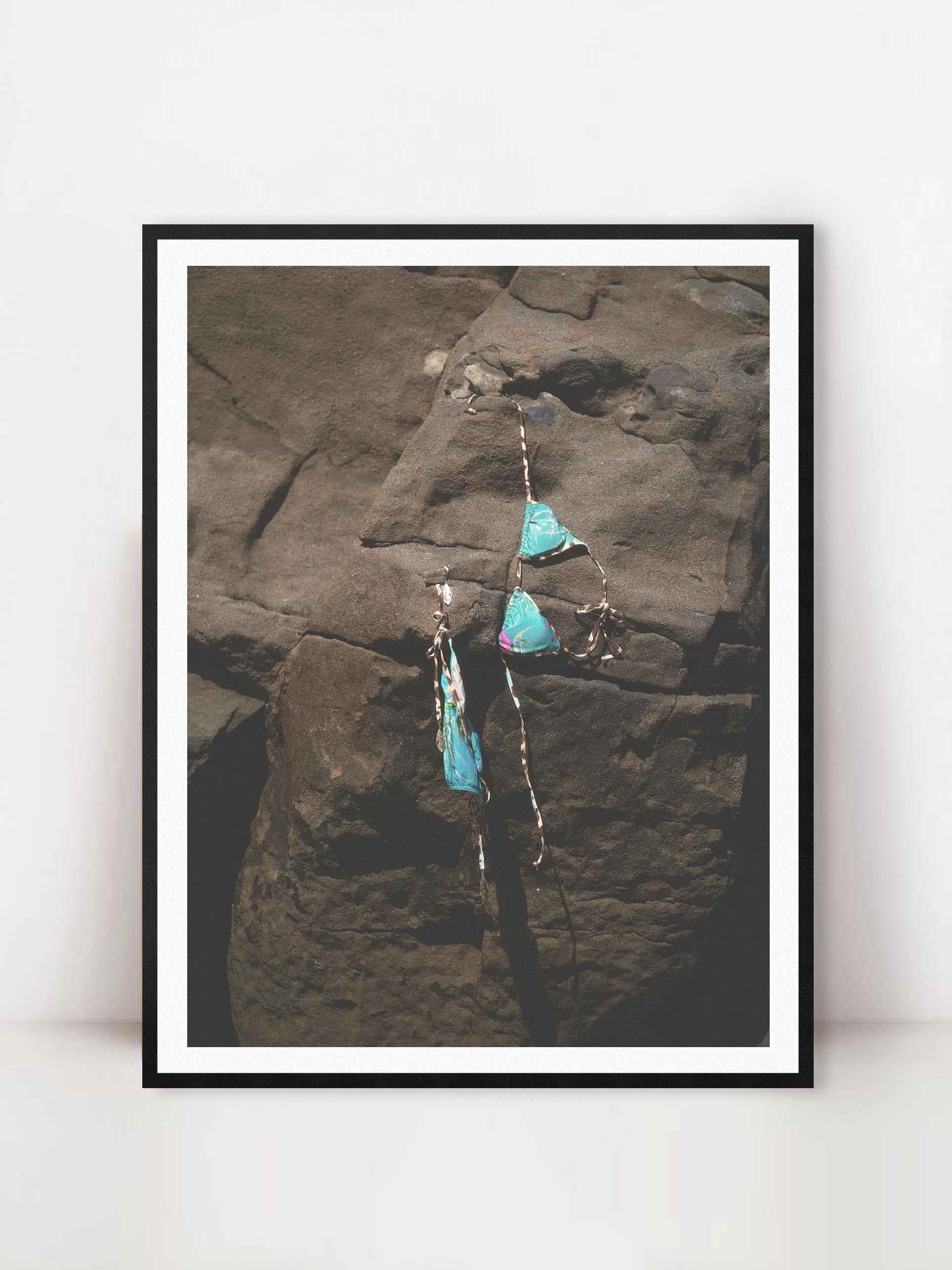 Photograph of a turquoise bikini sun-drying on the rocks in La Jolla, San Diego. Printed on premium Fuji Crystal Archive luster paper. Printed and hand packaged in San Diego, CA. A portion of proceeds from the Guimuse West Coast Collection goes towards the The Ocean Cleanup to help extract plastic pollution from our oceans.