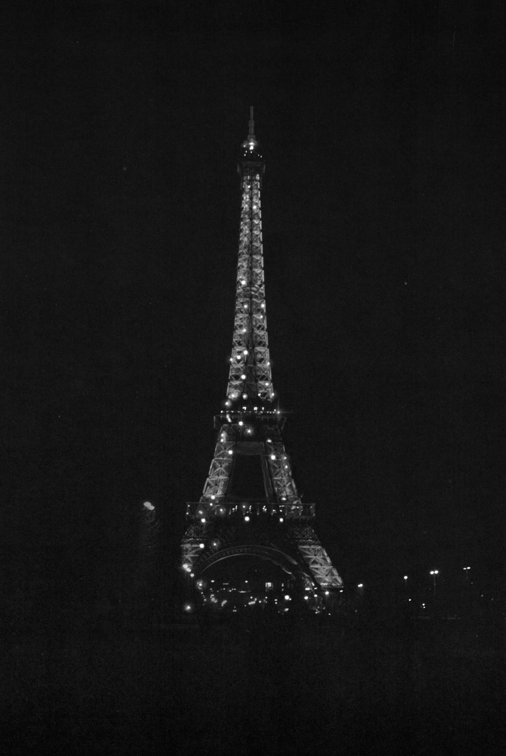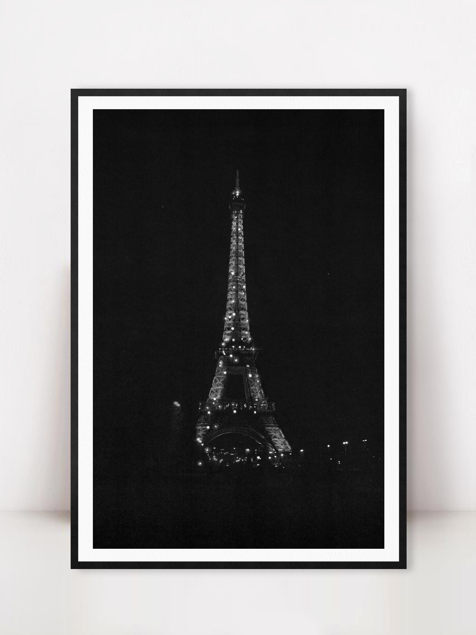 Black and white photograph of the Eiffel Tower at night. Printed on premium Fuji Crystal Archive luster paper. Printed, packaged and shipped from San Diego, CA.