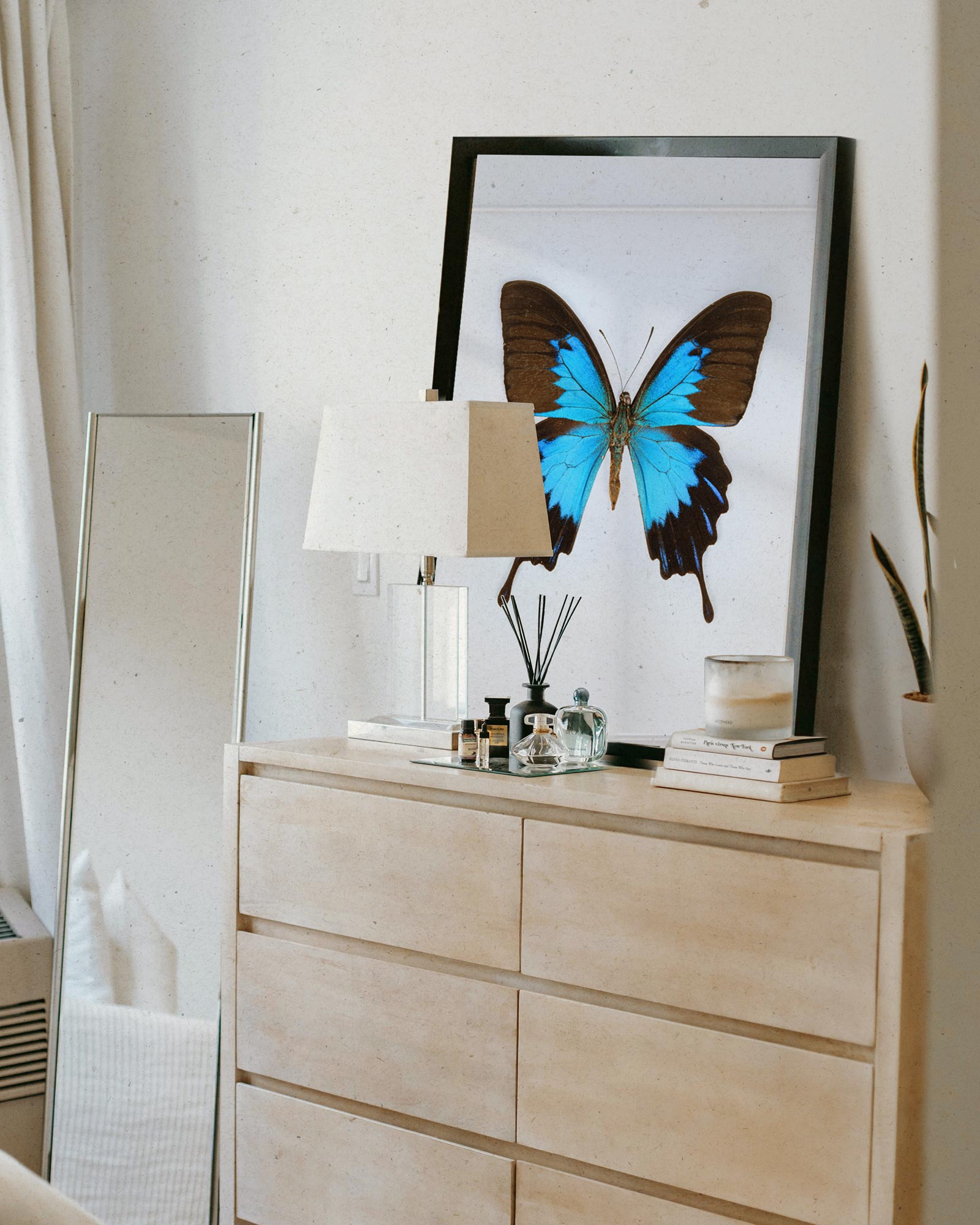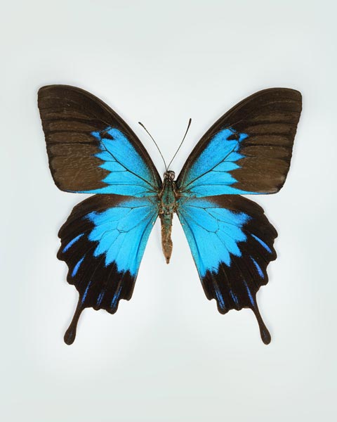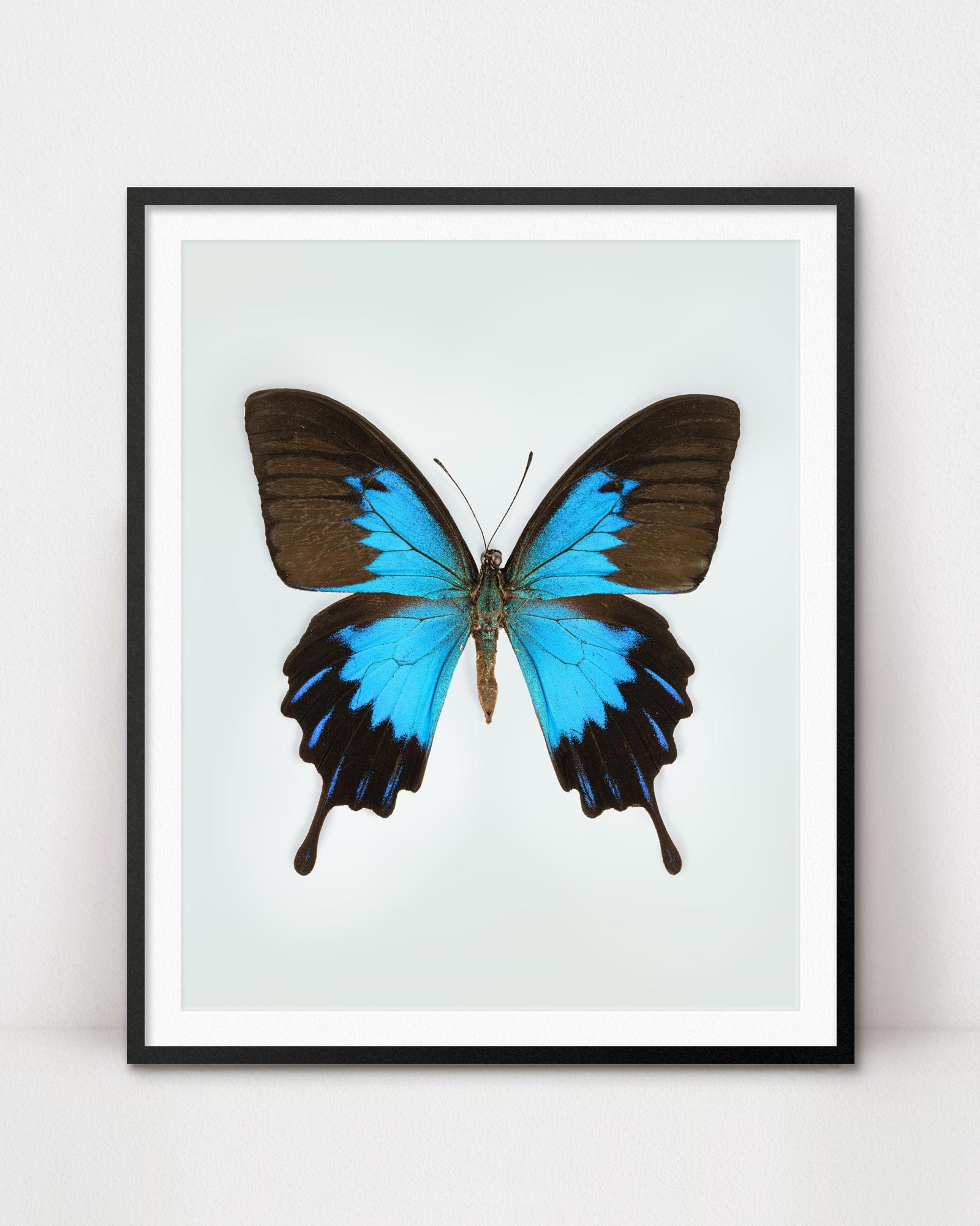 Macro photograph of a Papilio Ulysses butterfly specimen from the collection of BioQuipBugs.  Printed on premium Fuji Crystal Archive luster paper. Printed and hand packaged in San Diego, CA. A portion of proceeds from the Guimuse Butterfly Collection goes towards the World Wildlife Fund to help protect butterfly habitats.