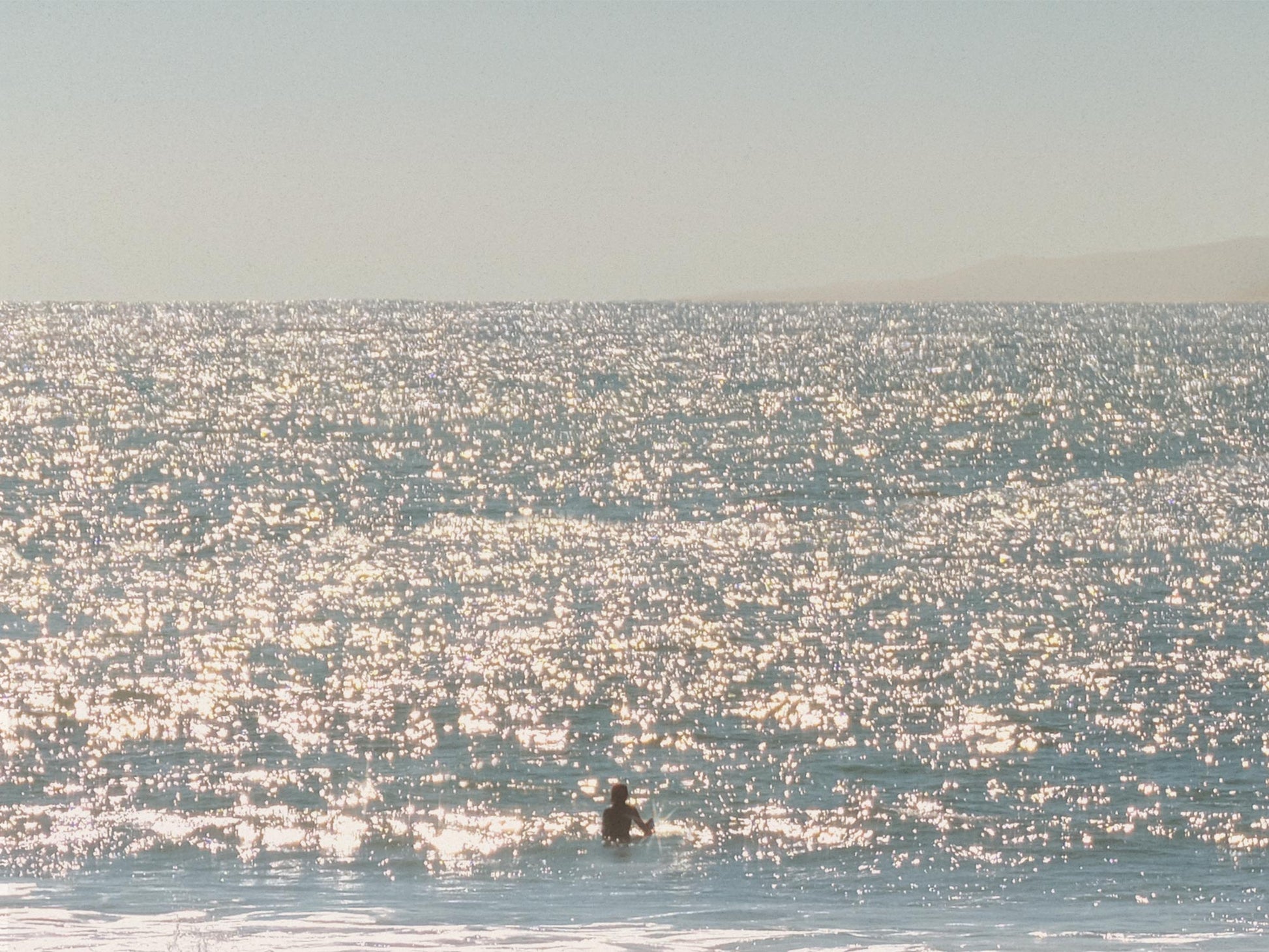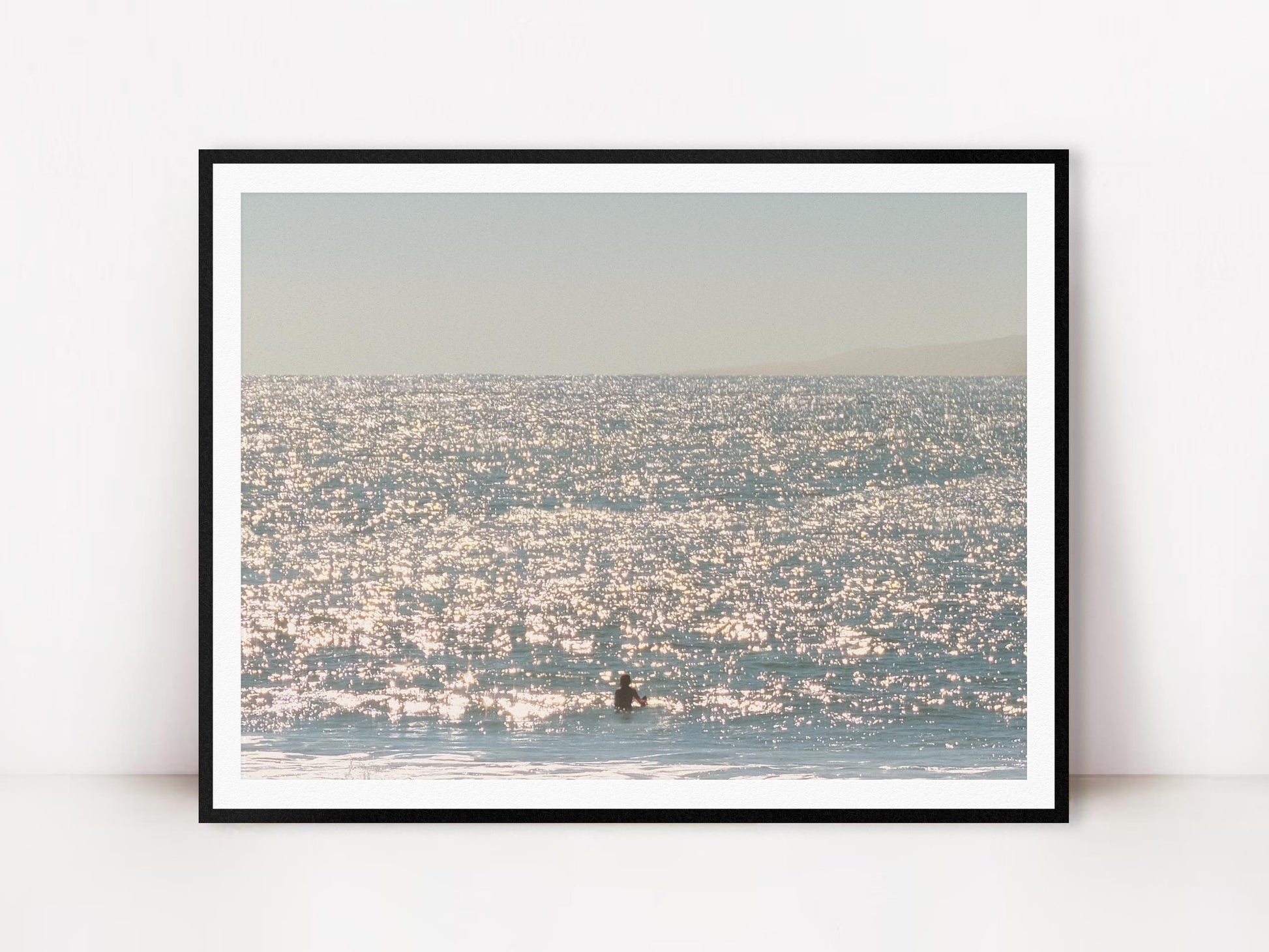 Photograph of a a surfer in blue glittering water.  Printed on premium Fuji Crystal Archive luster paper.  Printed and hand packaged in San Diego, CA.  A portion of proceeds from the Guimuse West Coast Collection goes towards the The Ocean Cleanup to help extract plastic pollution from our oceans.