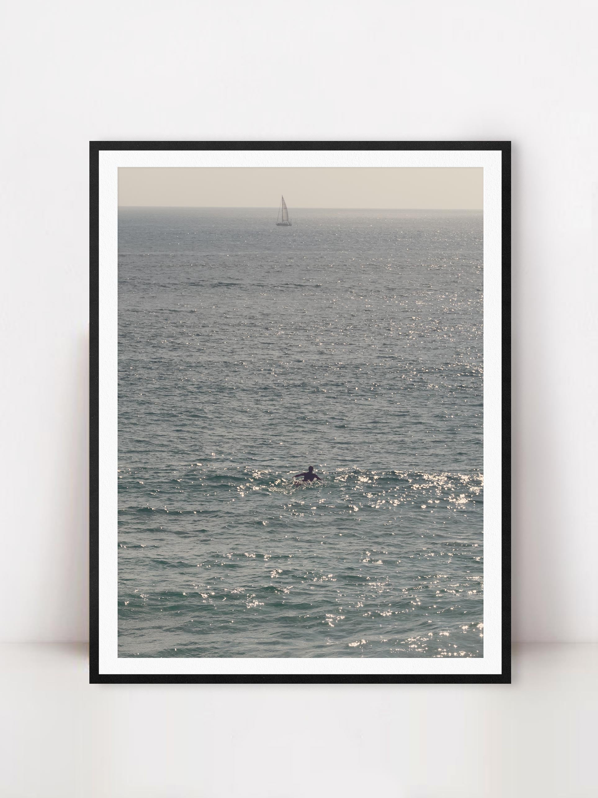 Photograph of a Dana Point surfer during dusk. Printed on premium Fuji Crystal Archive luster paper. Printed and hand packaged in San Diego, CA. A portion of proceeds from the Guimuse West Coast Collection goes towards the The Ocean Cleanup to help extract plastic pollution from our oceans.