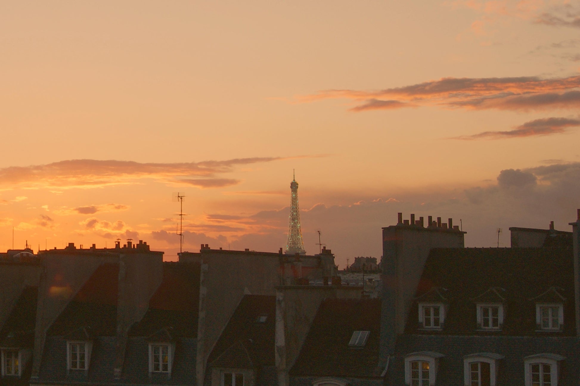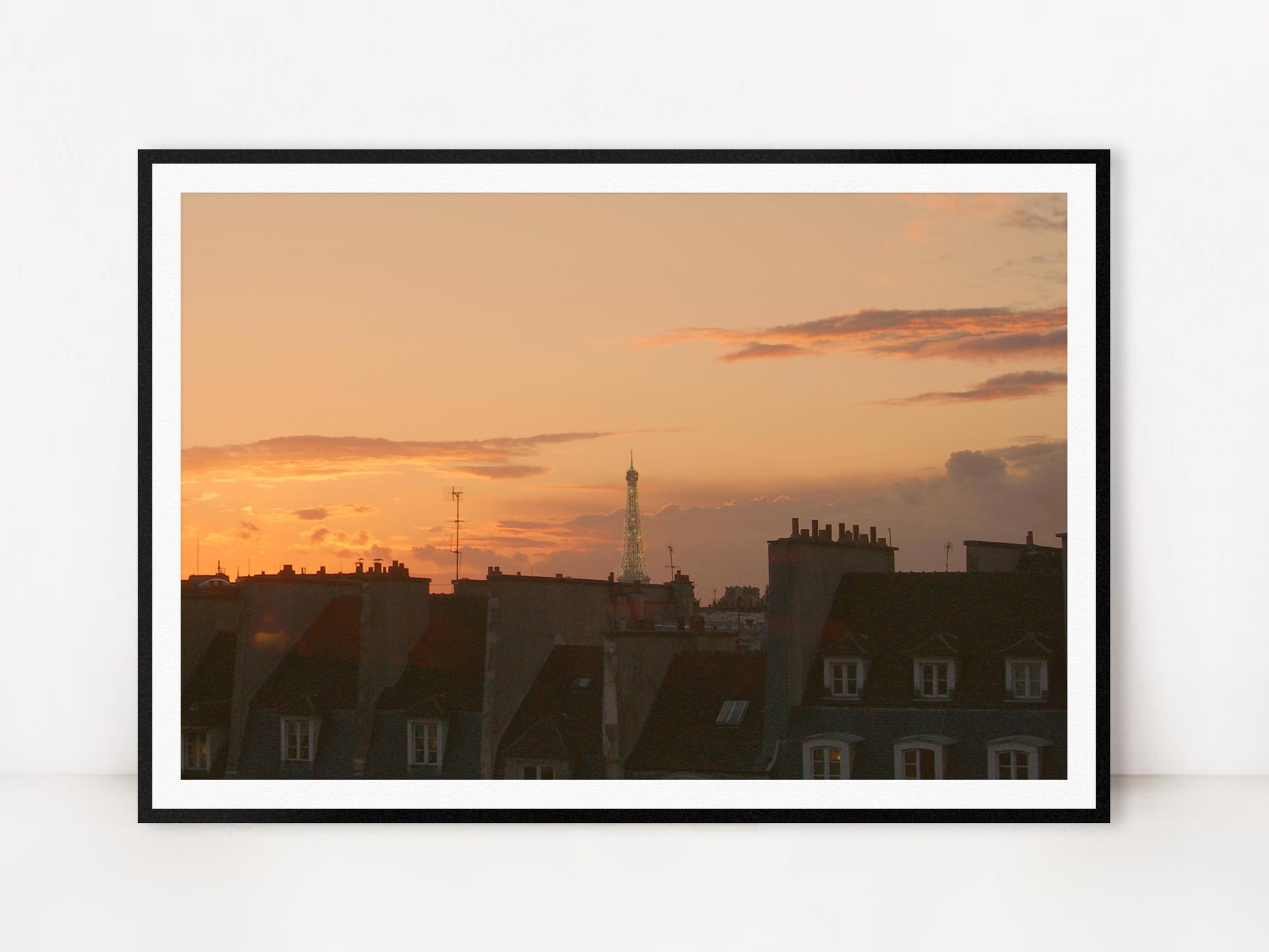 Photograph of the glittering Eiffel Tower at dawn. Printed on premium Fuji Crystal Archive luster paper. Printed, packaged and shipped from San Diego, CA.