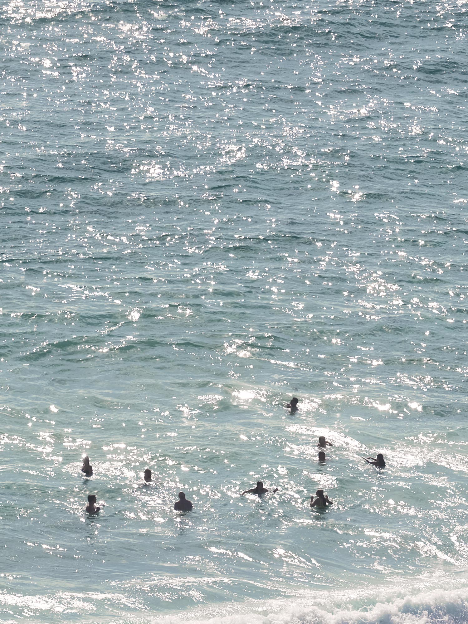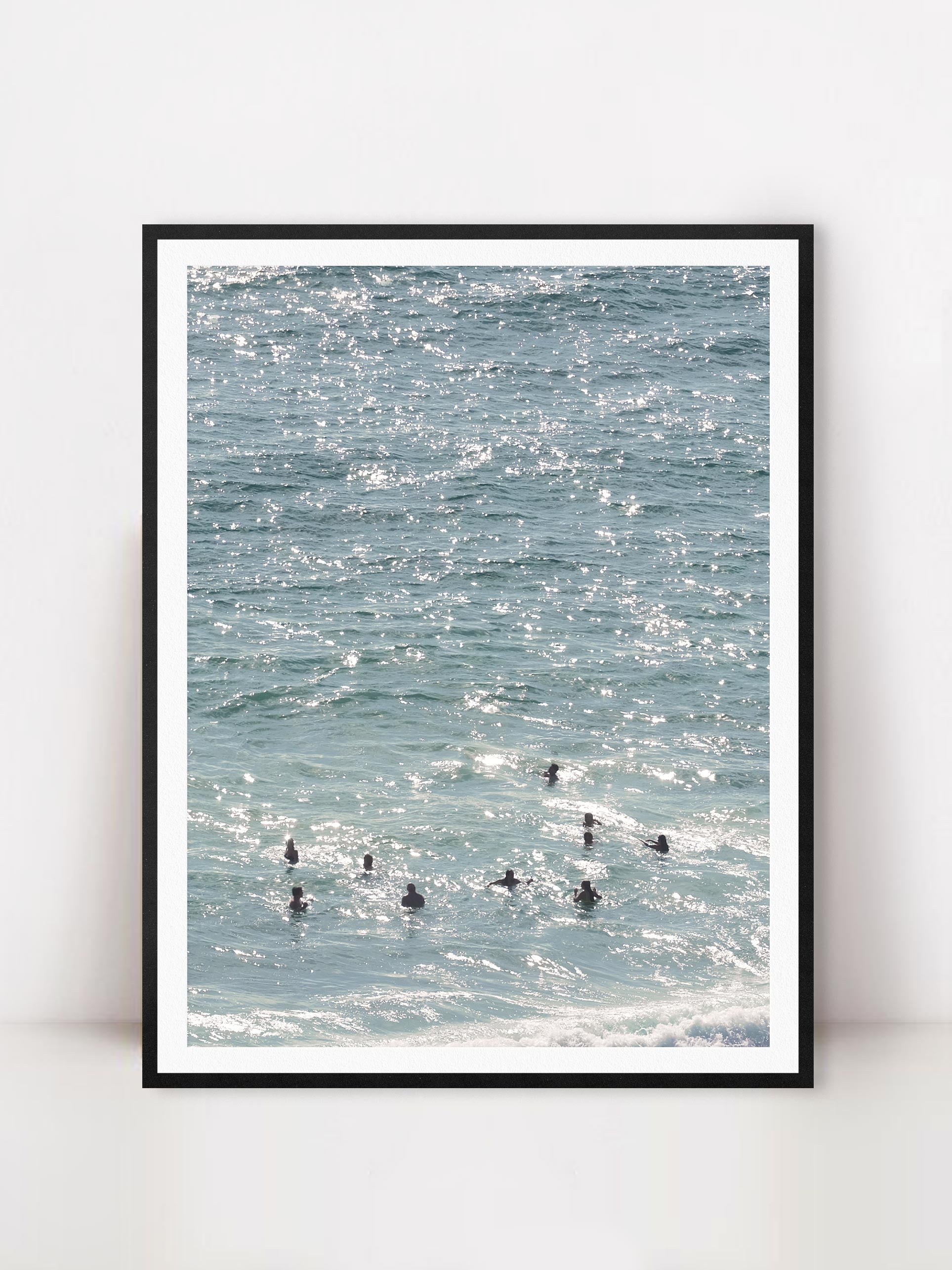 Photograph of swimmers in the waves in California.  Printed on premium Fuji Crystal Archive luster paper.  Printed and hand packaged in San Diego, CA.  A portion of proceeds from the Guimuse West Coast Collection goes towards the The Ocean Cleanup to help extract plastic pollution from our oceans.