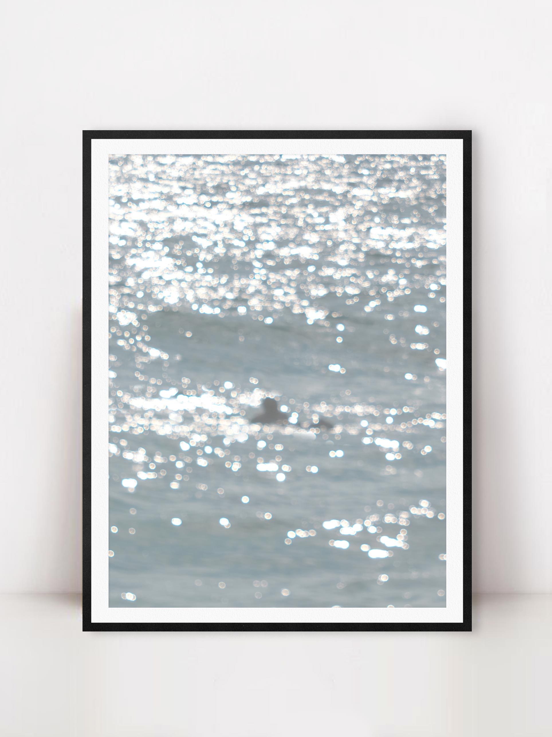 Photograph of a surfer in a bokeh California ocean. Printed on premium Fuji Crystal Archive luster paper. Printed and hand packaged in San Diego, CA. A portion of proceeds from the Guimuse West Coast Collection goes towards the The Ocean Cleanup to help extract plastic pollution from our oceans.