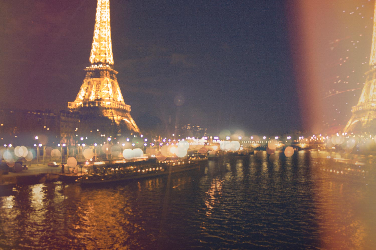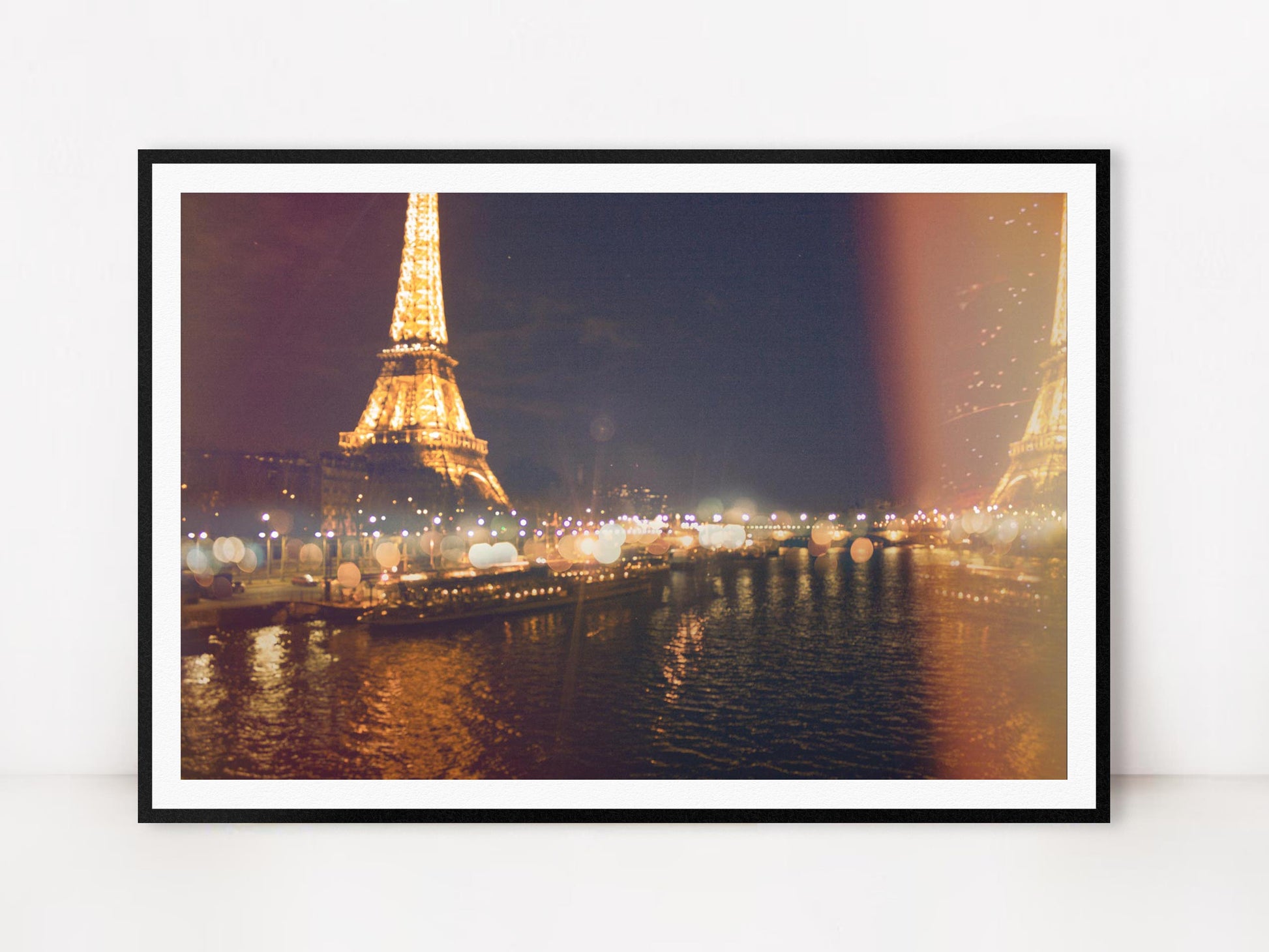 Double exposure photograph of the Eiffel Tower at night overlooking the Seine. Printed on premium Fuji Crystal Archive luster paper. Printed, packaged and shipped from San Diego, CA.