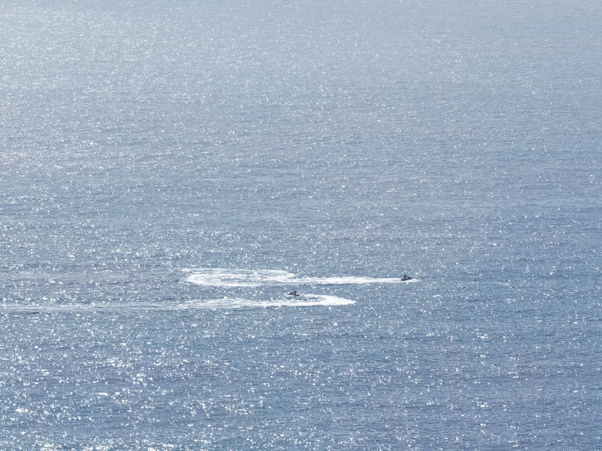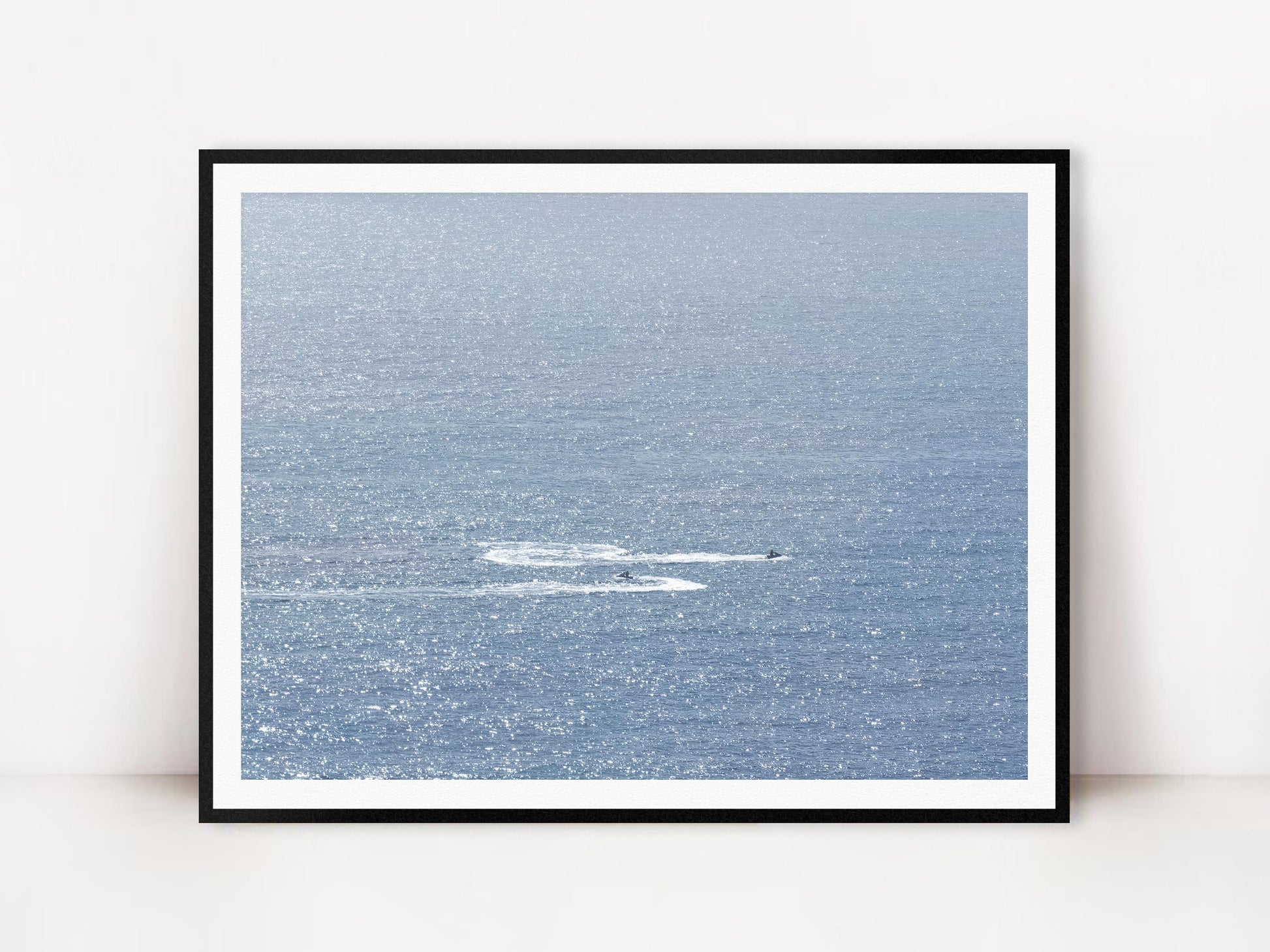Photograph overlooking two jet skis out in the Pacific Ocean, California. Printed on premium Fuji Crystal Archive luster paper. Printed and hand packaged in San Diego, CA. A portion of proceeds from the Guimuse West Coast Collection goes towards the The Ocean Cleanup to help extract plastic pollution from our oceans.