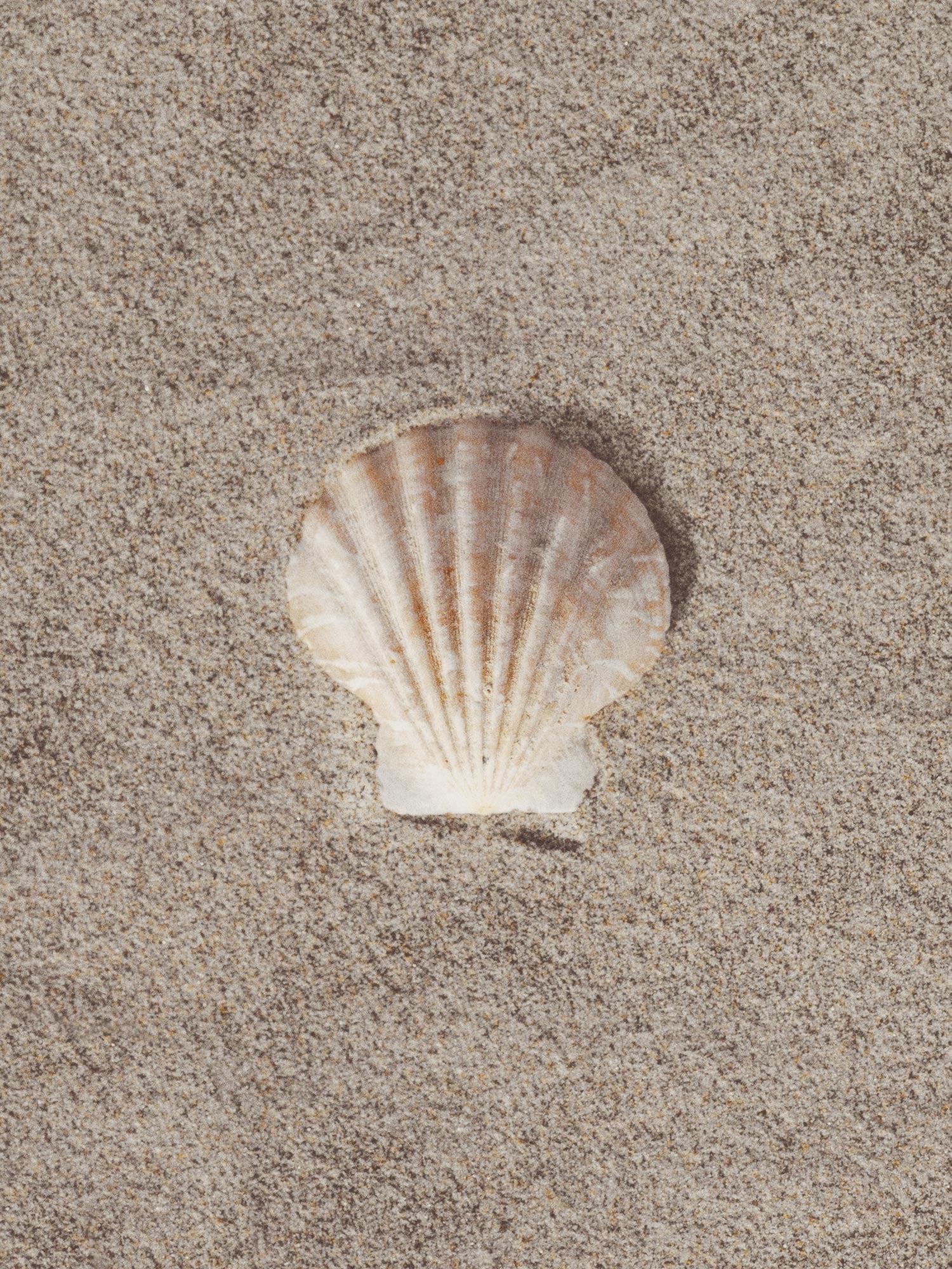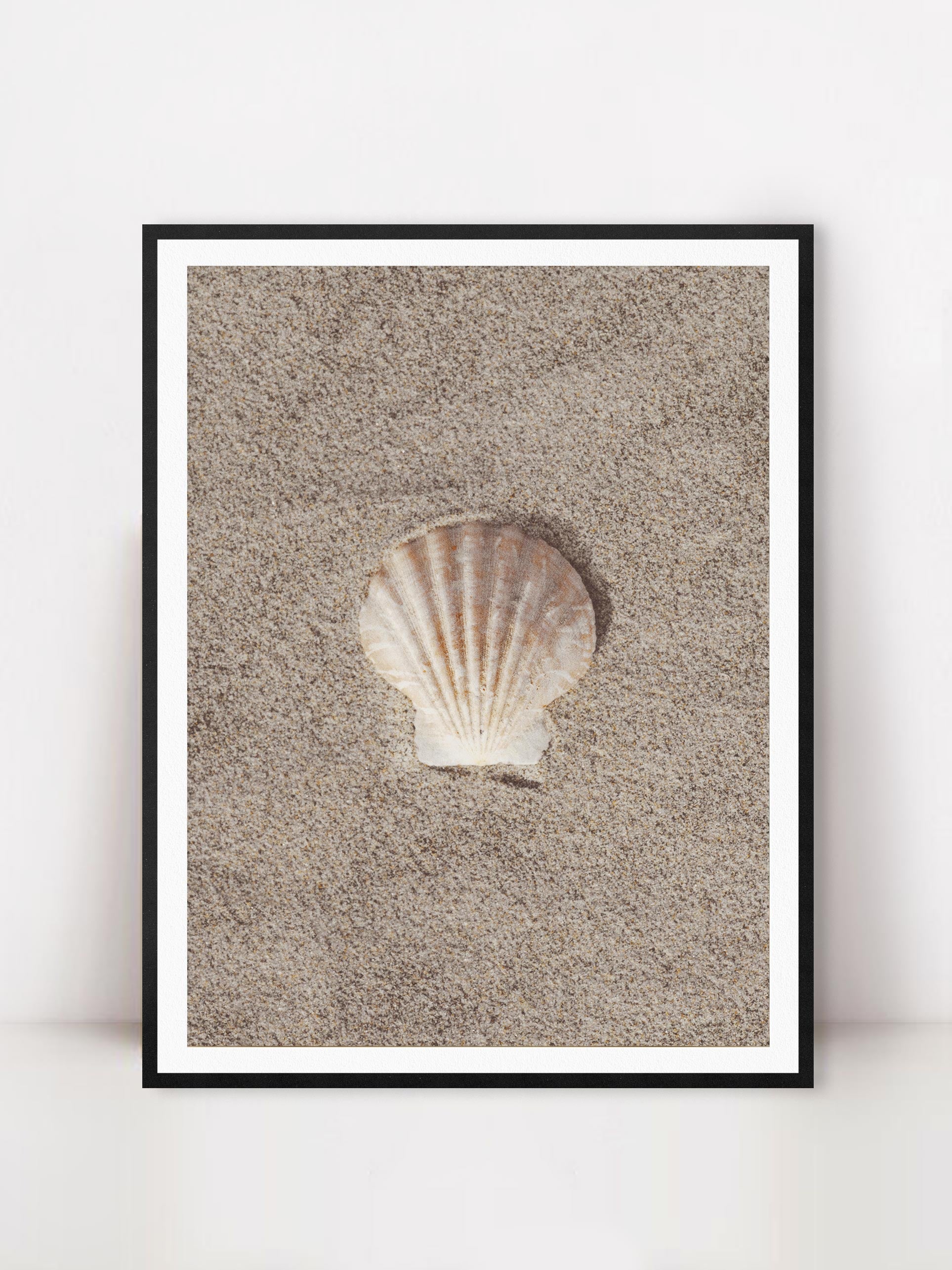Photograph of a beige shell in sand. Printed on premium Fuji Crystal Archive luster paper. Printed and hand packaged in San Diego, CA. A portion of proceeds from the Guimuse West Coast Collection goes towards the The Ocean Cleanup to help extract plastic pollution from our oceans.