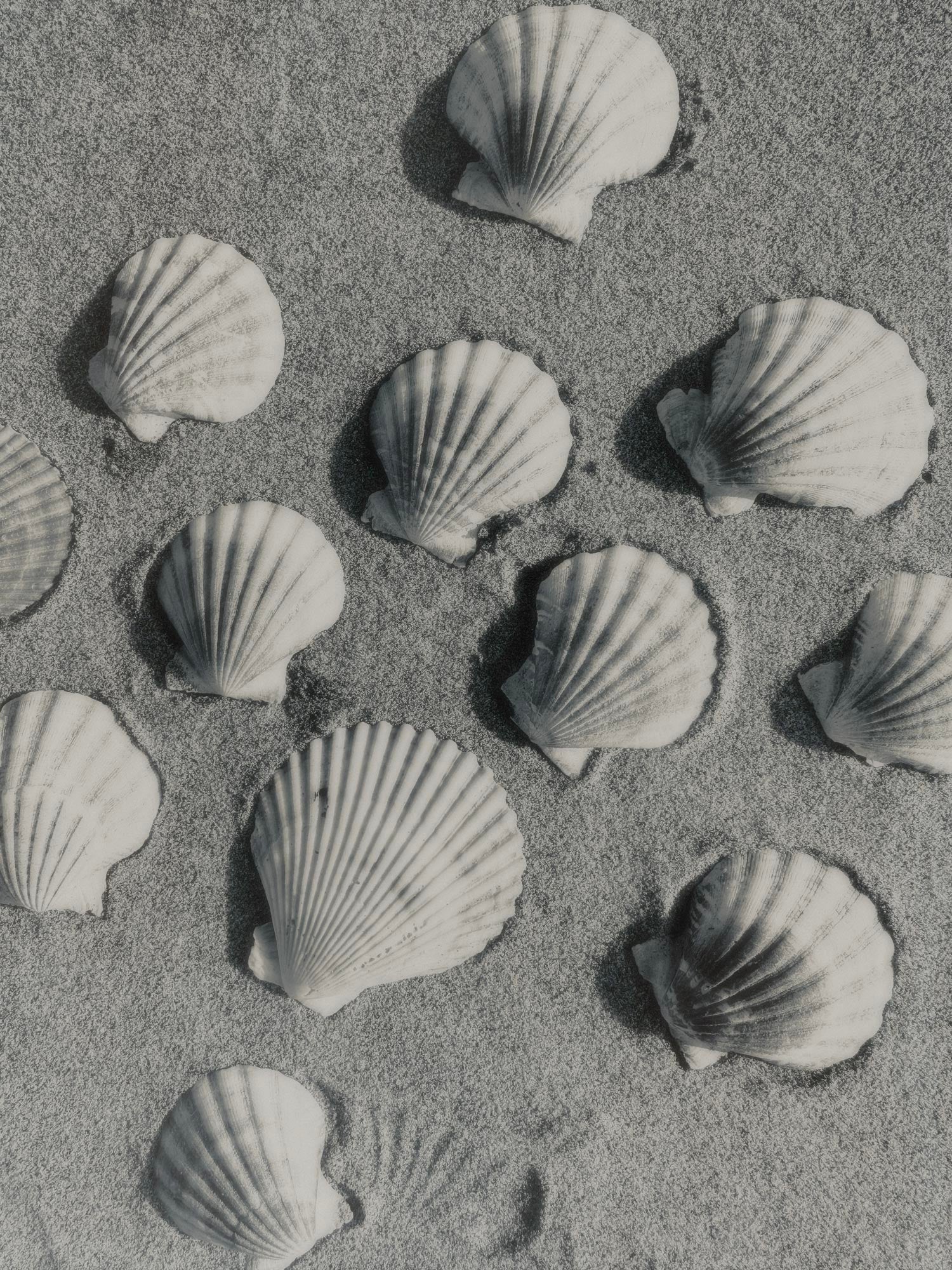 Black and white photograph of shells in the California sand. Printed on premium Fuji Crystal Archive luster paper. Printed and hand packaged in San Diego, CA. A portion of proceeds from the Guimuse West Coast Collection goes towards the The Ocean Cleanup to help extract plastic pollution from the oceans.