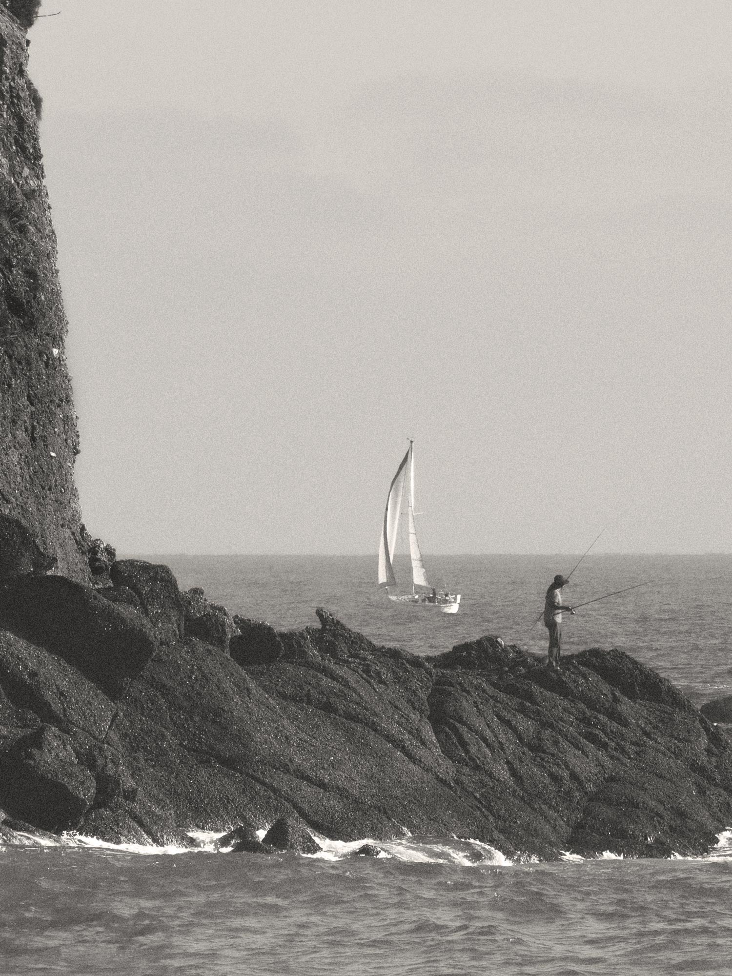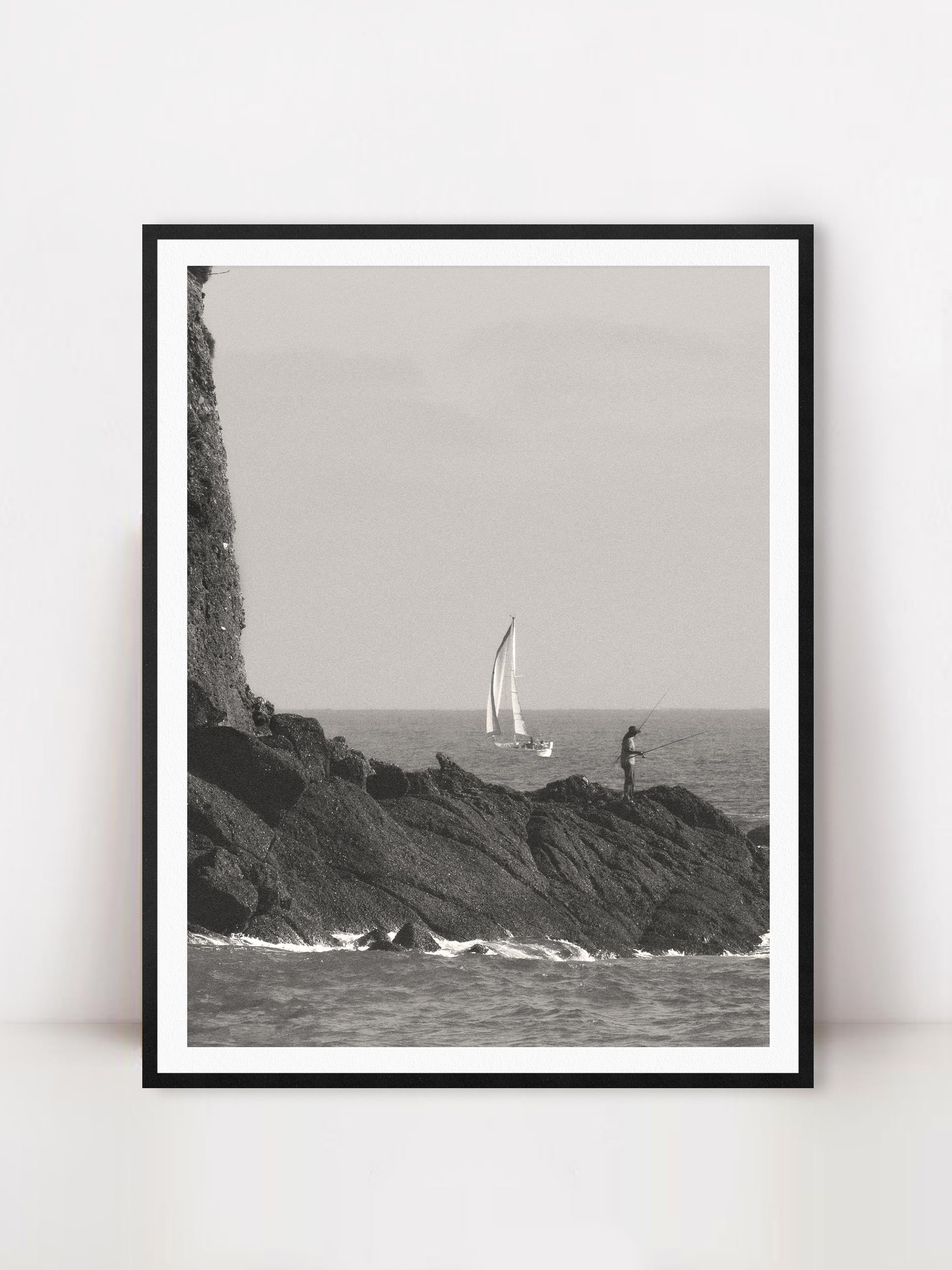 Photograph of a fisher on the rocks with a sailboat passing by. Printed on premium Fuji Crystal Archive luster paper. Printed and hand packaged in San Diego, CA. A portion of proceeds from the Guimuse West Coast Collection goes towards the The Ocean Cleanup to help extract plastic pollution from our oceans.