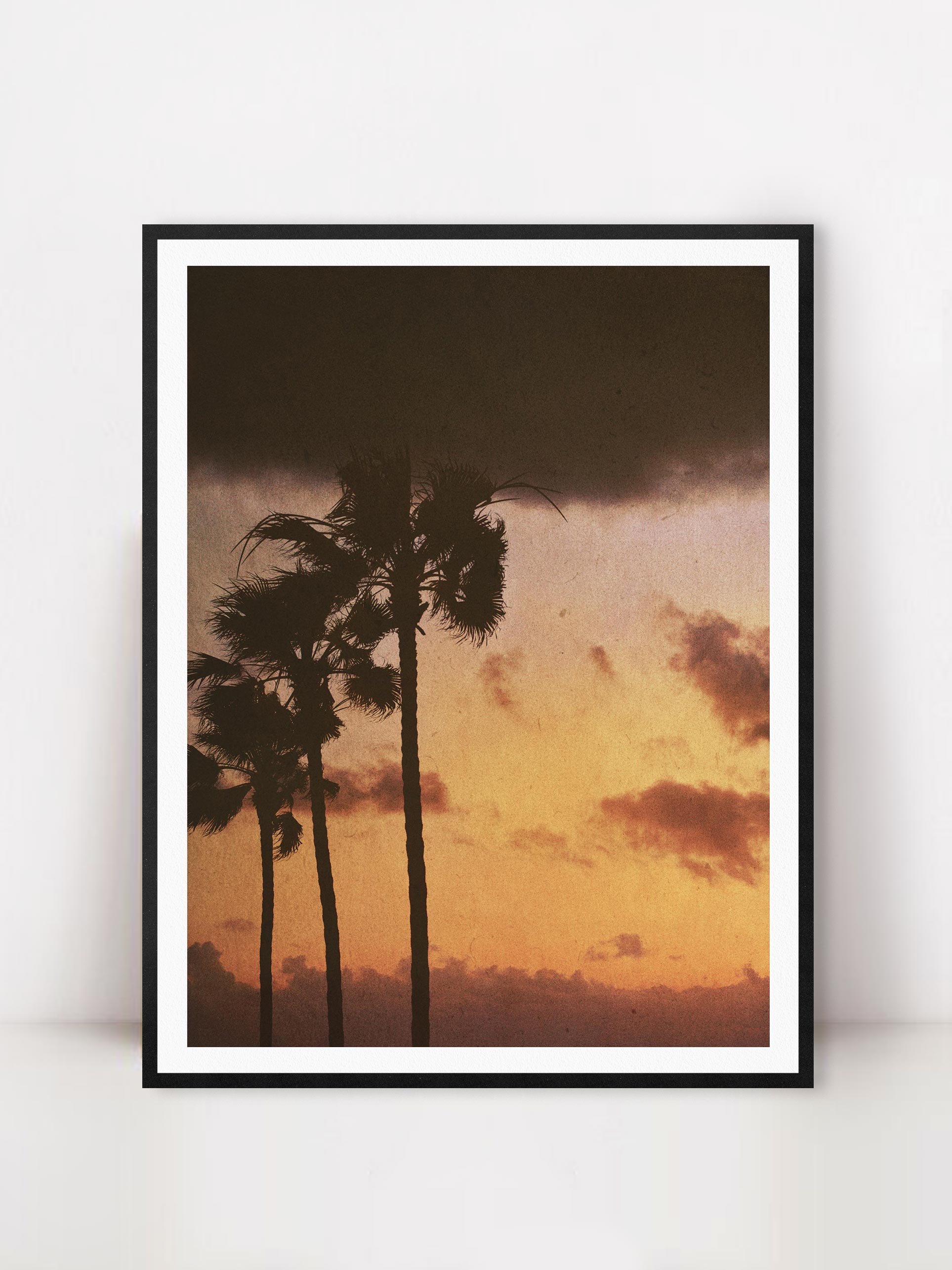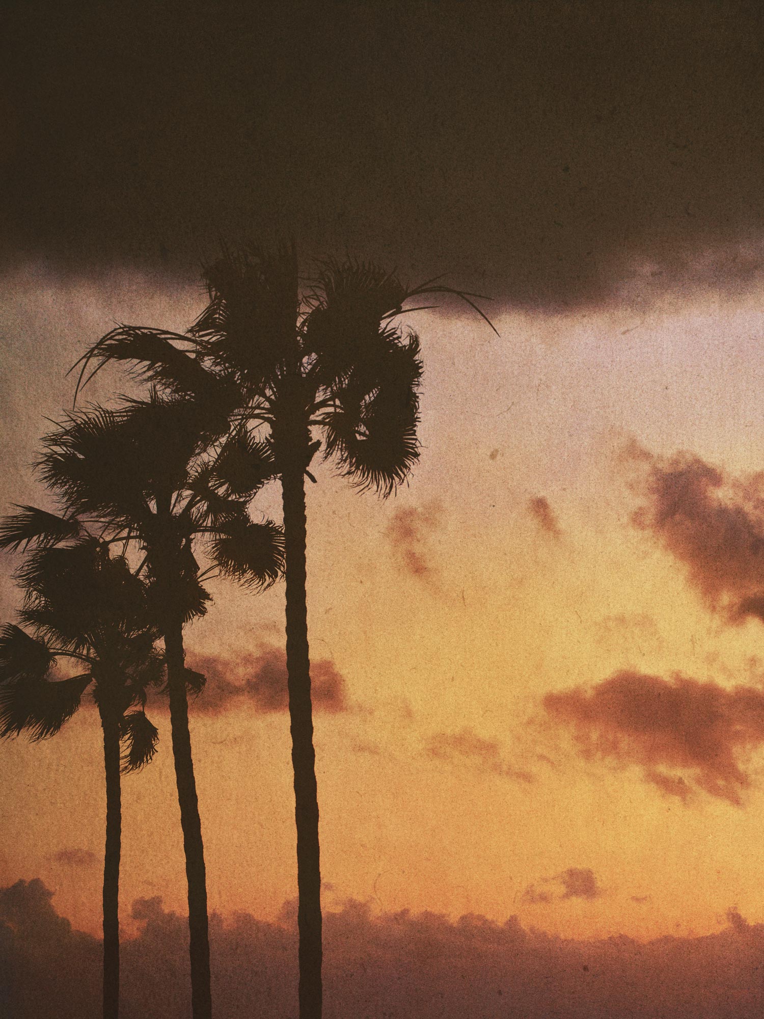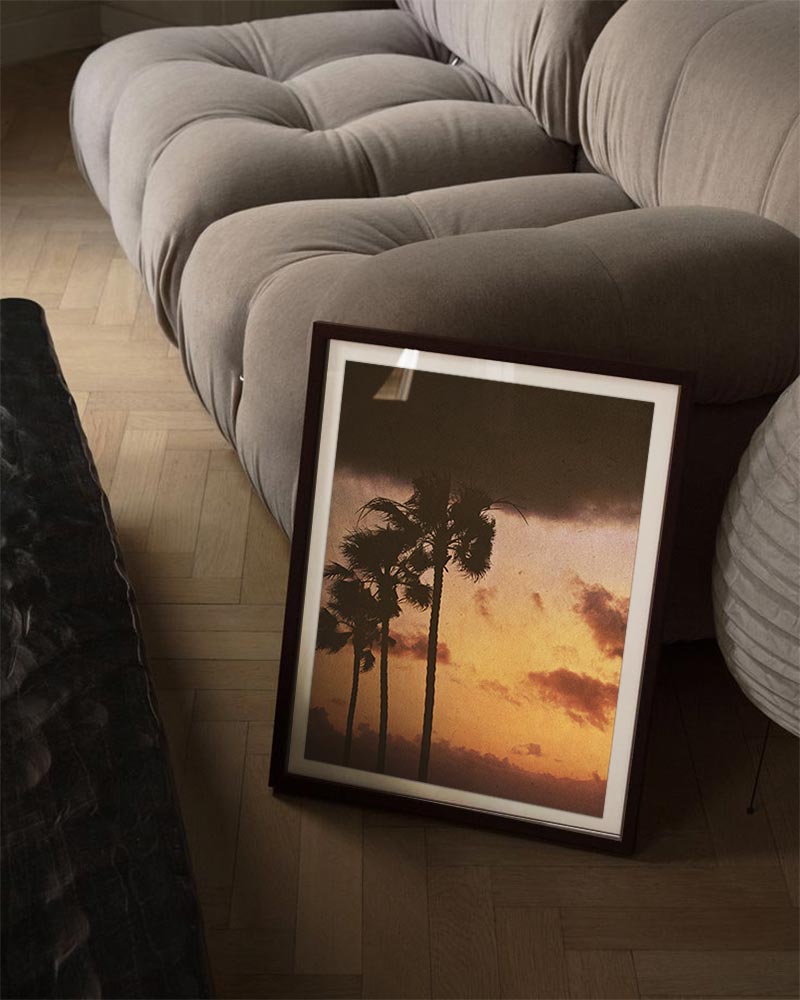 Photograph of palm trees after a tropical rain in Oceanside, California.  Printed on premium Fuji Crystal Archive luster paper.  Printed and hand packaged in San Diego, CA.  A portion of proceeds from the Guimuse West Coast Collection goes towards the The Ocean Cleanup to help extract plastic pollution from our oceans.